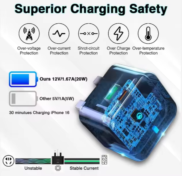 Ce chargeur rapide universel de 20 W prend en charge plusieurs options de sortie, notamment 9 V/2 A, 5 V/2,4 A et 12 V/1,5 A, répondant aux besoins de divers appareils tels que les lecteurs MP3/MP4. Il offre des protections complètes contre les surtensions, les surintensités, les courts-circuits et la surcharge. Fabriqué en matériau ignifuge en PC, il garantit sécurité et durabilité. Compatible avec les ports Type-C et les normes de prises britanniques, il est idéal pour une utilisation mondiale.